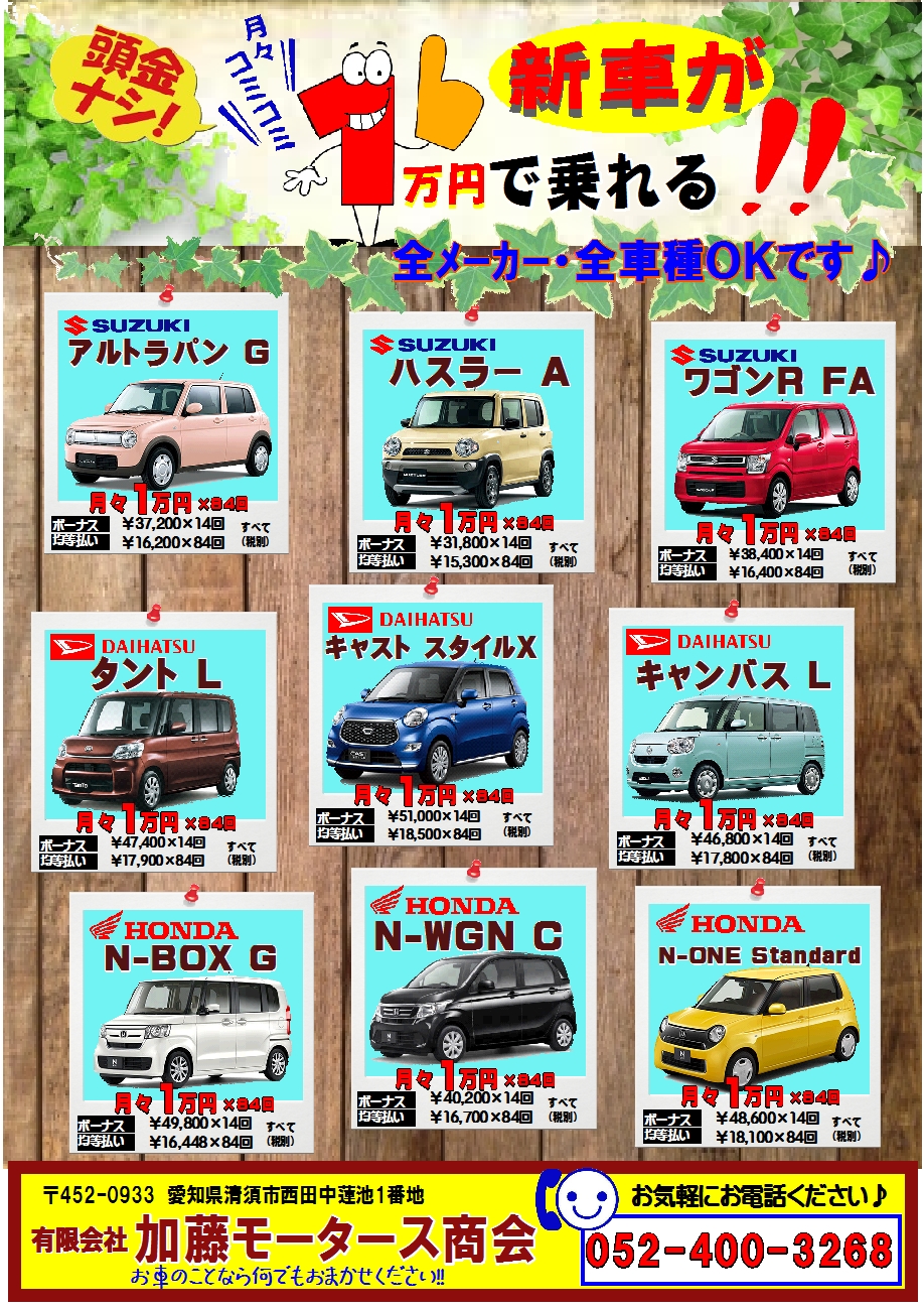 頭金なし!新車が月々1万円で乗れる!全メーカー・全車種OK♪